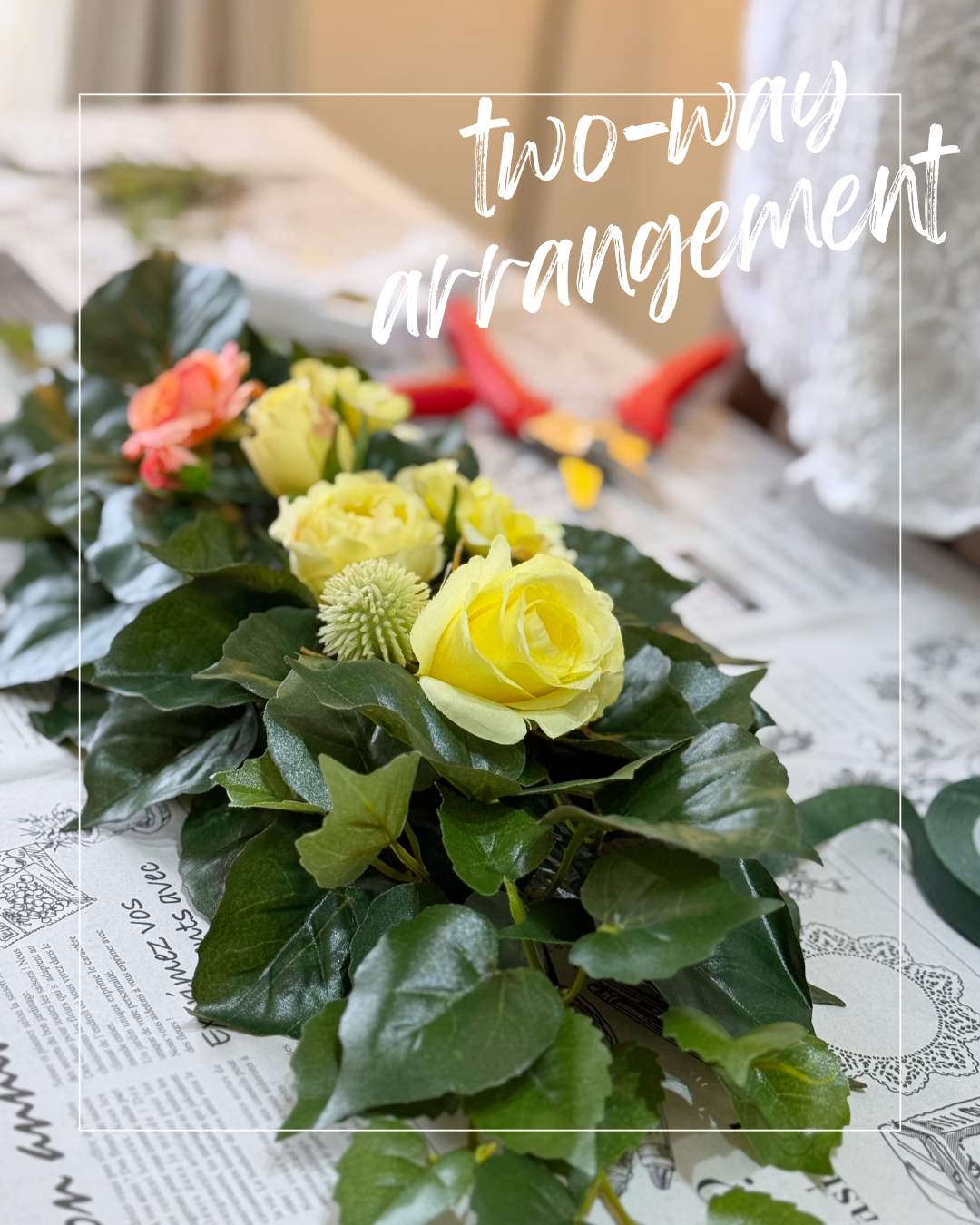 テーブルセンターピースにも壁掛けアレンジにもなる2WAYアレンジをお作りいただきました。