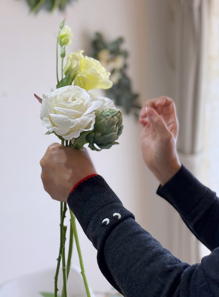 サイドテーブルなどの上に置いたり、花瓶に挿したり、また、逆さにして壁にかけてスワッグにしたりと、さまざまな飾り方ができるインテリアフラワーです。