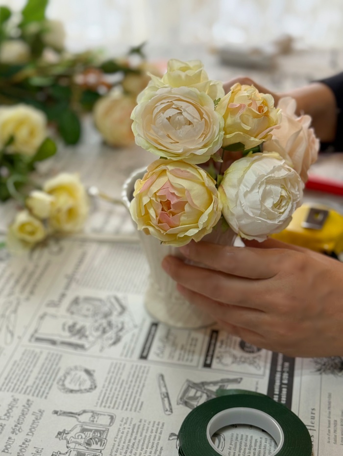 「随分間が空いたので、忘れてしまって」とおっしゃっていましたが、茎にワイヤーをかけたり、その後フローラルテープを巻き付けたりといったフラワーアレンジメントの基本の「き」の作業は、あっという間にクリア👏