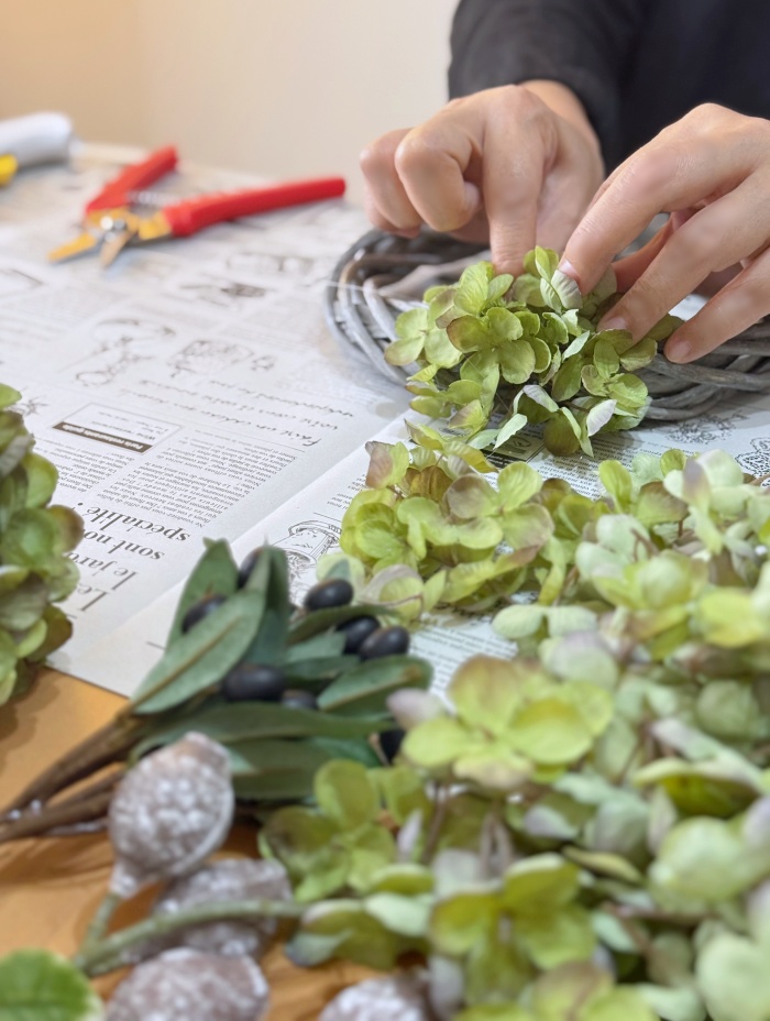 3回目のレッスンのこの日は、たくさんの紫陽花を使ったグリーンリースをお作りいただきました。