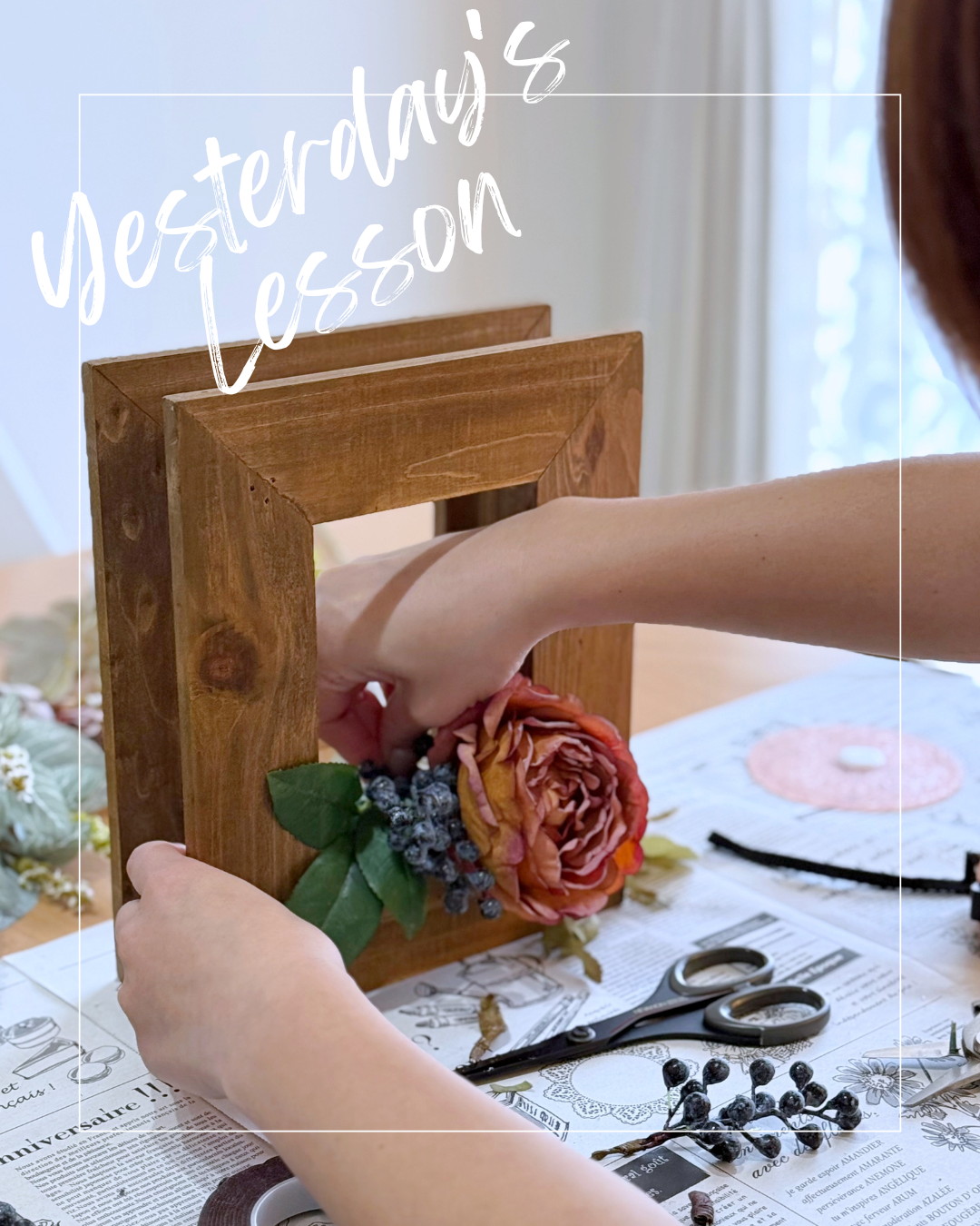 10回目のレッスンでは、木製フレームを使ったアレンジメントをお作りいただきました。