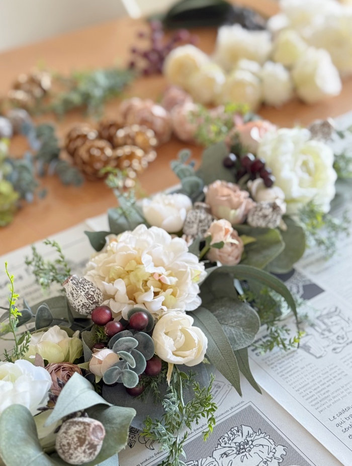 落ち着いたグリーンのユーカリにベージュのバラ、白いラナンキュラス、ゴールドの松ぼっくりなど、これからの時期にぴったりの素敵な作品が完成✨
