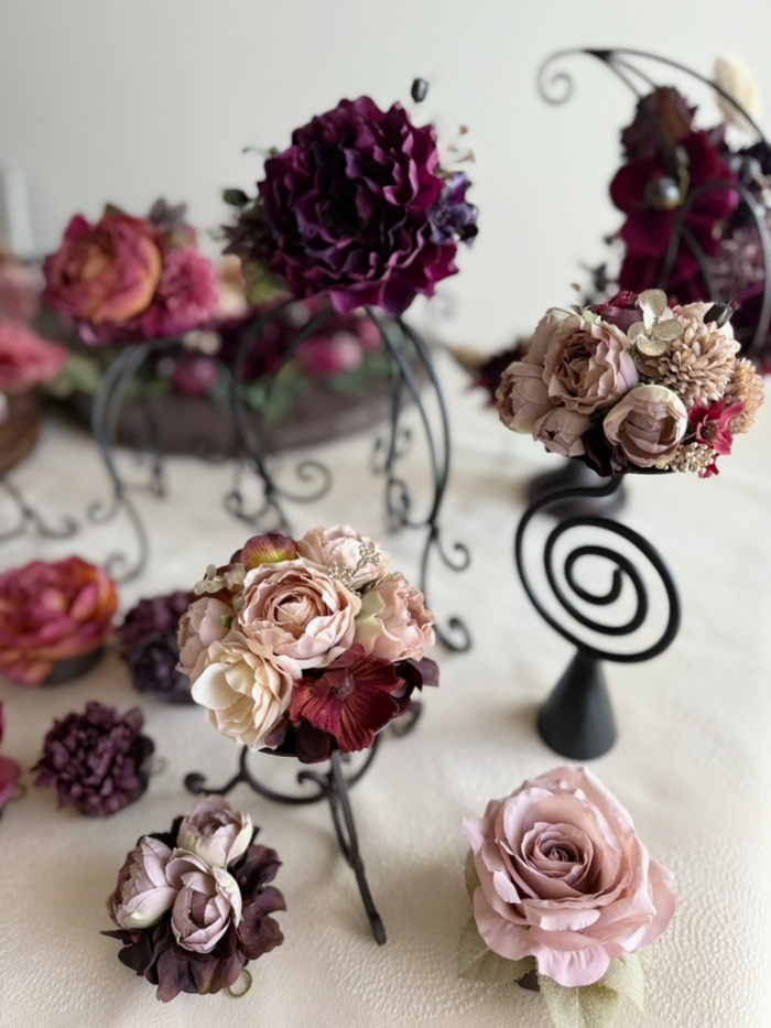蔓をからめたり、お花がこぼれ落ちるようなデザインにしたり。 曲線のラインが美しいアイアンの花器には、陶器のものとはまた違った魅力があります。