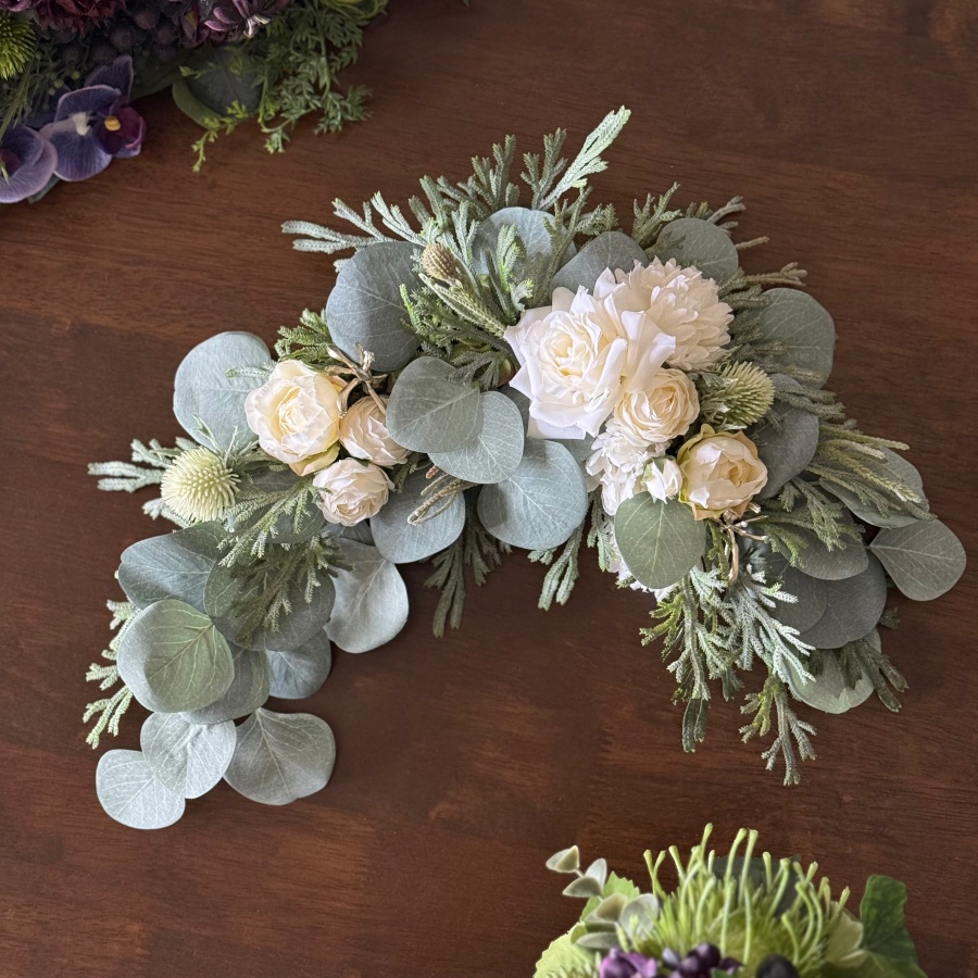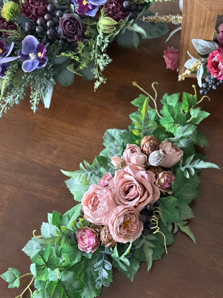お水が要らないアーティフィシャルフラワーの特長が生きる作品で、壁面のほか、ドアや鏡なども飾ることができます。 ザ・ライツが得意とするインテリアフラワーのアレンジメントです。