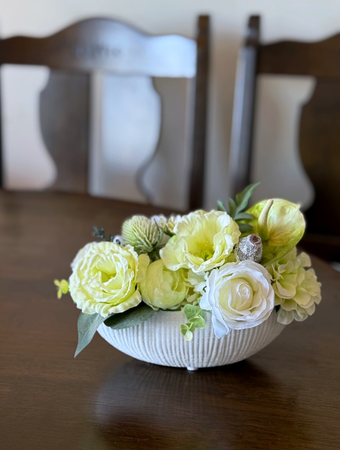 2026年最初のシーズナルレッスンは、白とライトグリーンのお花を使ったコンパクトなアレンジメント。